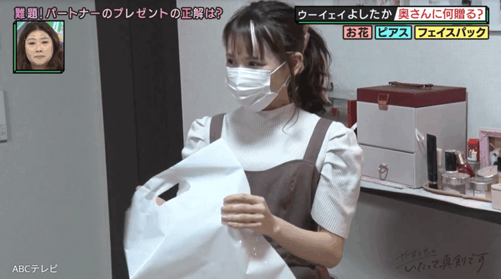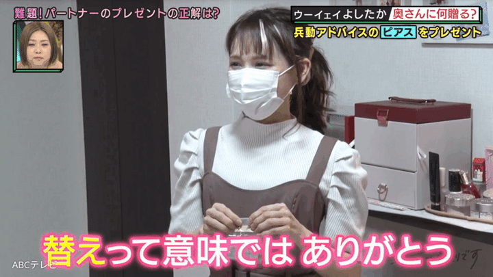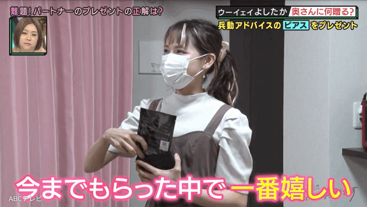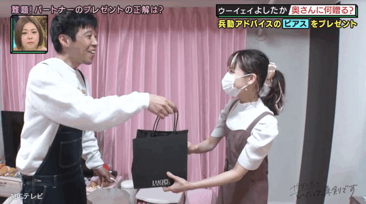 普段つけているピアスと似ているということは、妻の好きなデザインを選べたということ。プレゼント選びで失敗ばかりだったよしたかとしては、かなりの成長だ。彼の成長はこれだけではない。なんとよしたかは、念のためにフェイスパックも購入していたのだ。これには妻が「今までもらった中で一番嬉しい!」「ありがとう!」と心の底から笑顔に。一方のよしたかは「これ(が正解)なんや~」と笑った。