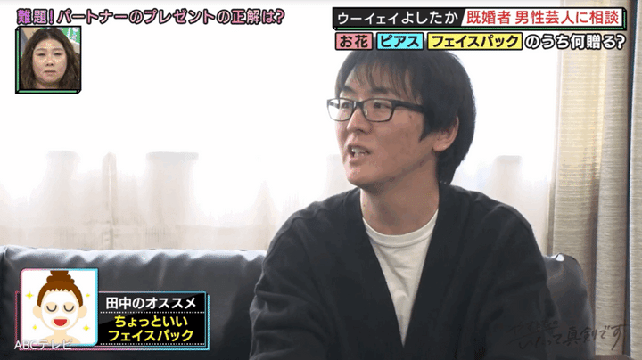 最後によしたかがアドバイスを求めたのは、結婚10年目の田中一彦(スーパーマラドーナ)。よしたかと家族ぐるみで仲が良く、彼ら夫婦をよく理解している。そのため田中は、よしたかのセンスのなさを指摘しつつ「(奥さんは)美容好きやもんな」ということで、フェイスパックを推した。