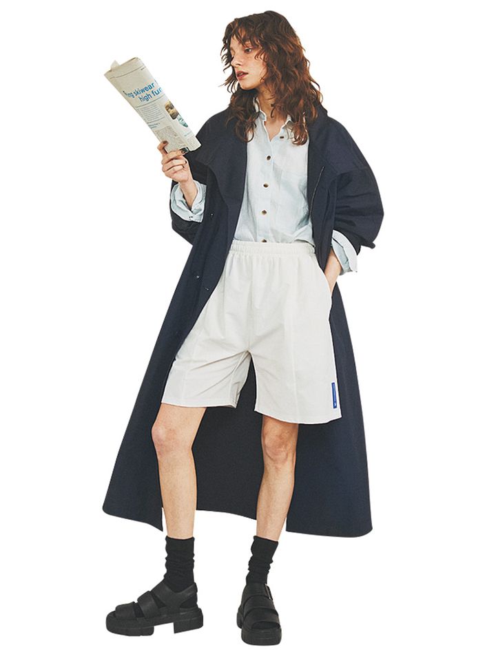【STYLING POINT】ショートブーツ的に組み合わせた黒ソックス+黒サンダルで、ひざ丈パンツをバランスアップ。ばさっとスプリングコートを羽織って、長短にメリハリをつけるとショートパンツもすんなりなじむ。