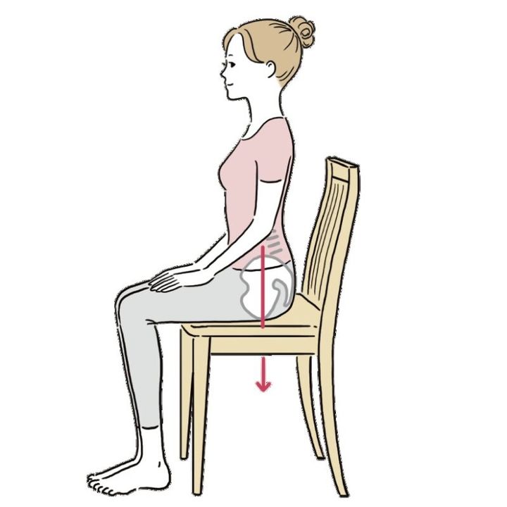 お尻の穴が真下を向いていることを意識して座ると、それだけで骨盤が立ちます。いすの座面の高さは膝下の長さと同じくらいになるようにすると、理想的な座り方に。また、脚はなるべく直角に曲げることを心がけて。