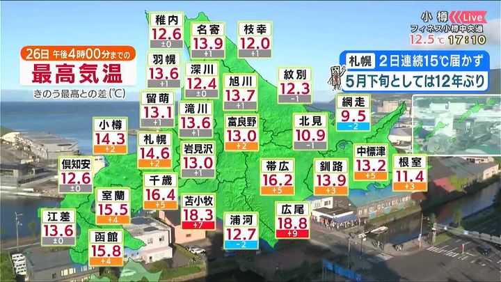 午後4時までの最高気温は広く4月下旬並みで、道内最も高くなった広尾町でも18.8度で20度に届きませんでした。札幌は14.6度で、このままいくと2日連続で15度に届かない見通しです。5月下旬としては12年ぶりの寒さです。