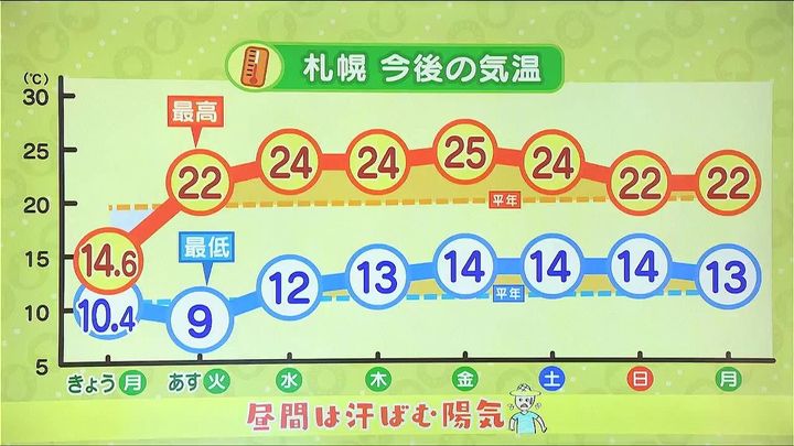 今後の札幌の予想気温です。最高気温はあす27日(火)からグンと上がって、連日20度超え。水曜日からは25度くらいまで上がり、半袖で過ごせるくらいです。ただ、朝晩との気温差は大きくなります。あす朝も9度と冷えるので、服装選びに気を付けて下さい。気温変化で体調を崩さないようにしてくださいね。
