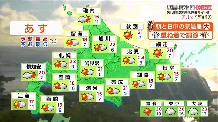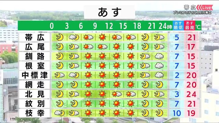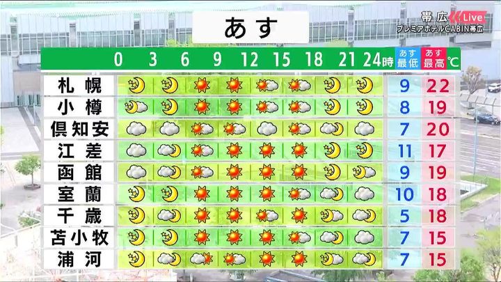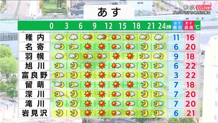 各地で晴れて風も弱まります。最高気温は北見で24度、帯広や旭川も20度を超えますが、朝は道東方面の内陸で0度くらいまで下がります。重ね着が必要です。