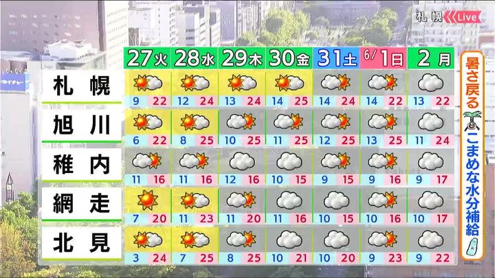 札幌や旭川は晴れて水曜日以降は25度くらいまで気温が上がります。運動会の練習も暑さ対策が必要です。お子さんに水筒を持たせましょう。稚内やオホーツク海側は、週末は雲が広がります。