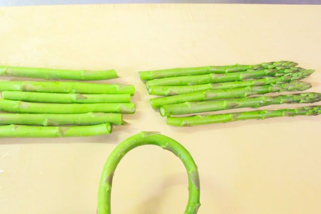 このお料理で使うのは、穂先側だけ。根元は他の料理に使ってくださいね。ちなみに今回は、根元を茹でて一緒に盛り付けることにしました。