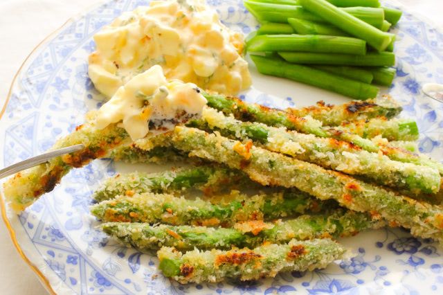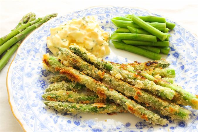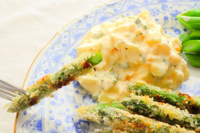 アスパラガスは穂先のやわらかい方だけを使いましたが、バッター液もパン粉もたくさん残ったので、根元側も硬い皮を薄く剥けば、同じように作れると思います。