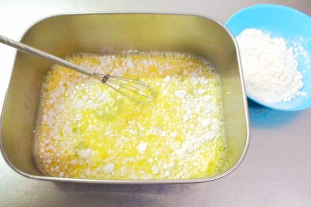ダマにならないよう、薄力粉を2回に分けて加え、都度よく混ぜました。