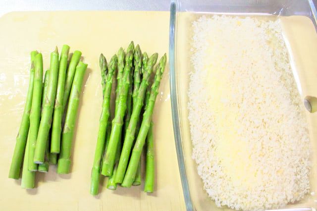 2. 洗ったアスパラガスを半分に折り、パン粉に粉チーズを混ぜます。