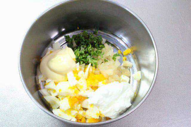 1. 粗く刻んだゆで卵、らっきょう、パセリ、マヨネーズ、ヨーグルトを混ぜて、タルタルソースを作ります。
