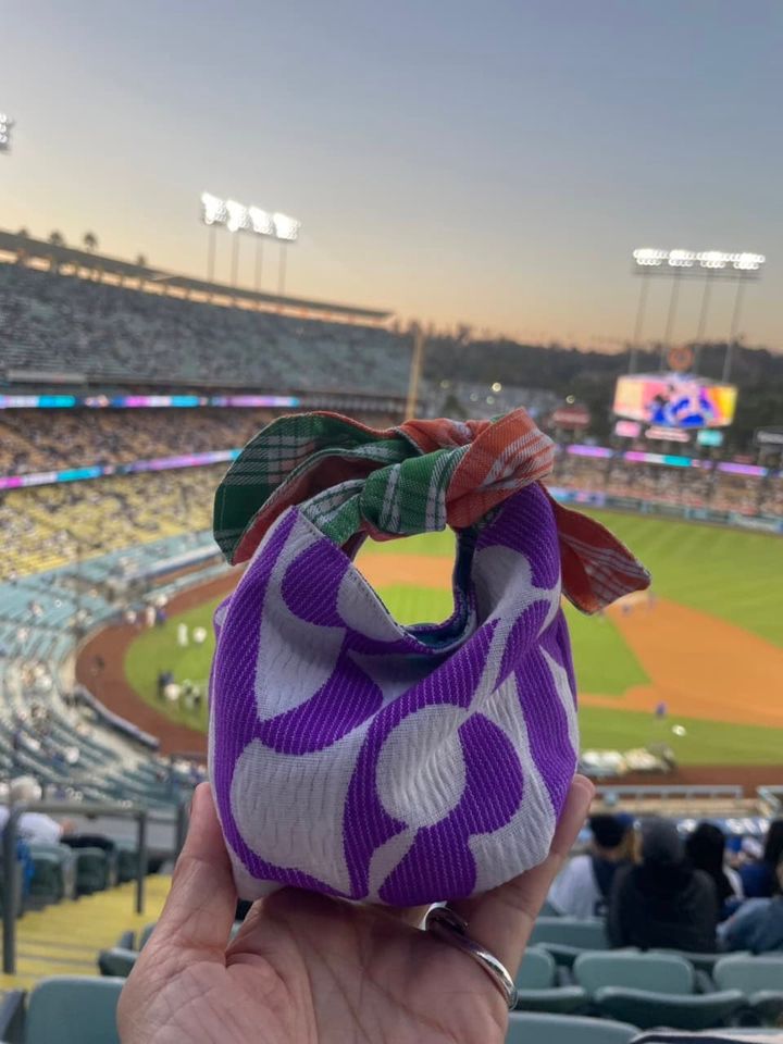 2024年、ドジャーススタジアムに大谷翔平選手が出場する試合を観に行ったとき。スタジアムは飲食物の持ち込みは禁止ですが、なぜかおにぎりだけは持ち込みOKということで、スパムむすび入れにおにぎりを入れて。