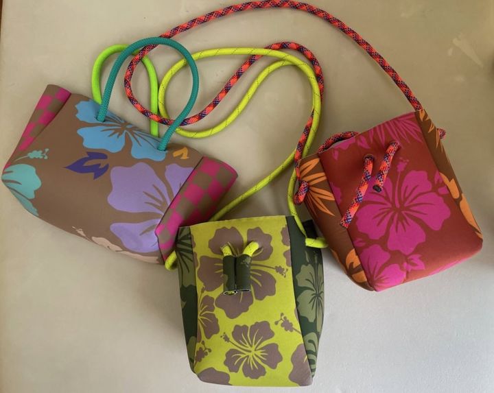 ウェットスーツなどにも使用されるネオプレン素材で軽くて丈夫です。次はパソコンが入るサイズを狙ってます! ローカル雑誌「ホノルルマガジン」では、Best Beach and Beyond Bag of Honolulu 2024にも選ばれたそう。(写真は「at Dawn」にて。現在、写真のデザインのバッグは販売していません)