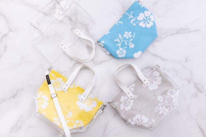 ロイヤル・ハワイアン・センター店の限定は3WAYのクリアトート。ハイビスカス柄のバッグは取り出すとポーチとしても使えます。付属のストラップをつければショルダーバッグに。各65ドル。