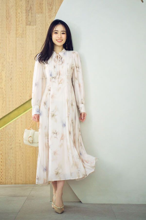 甘すぎないぼかし花柄と優しげながシフォン素材の絶妙なフェミニンさが大人レディのツボ♡ スタイルアップを誘う高め位置のウエスト切り替えや細部に施されたプリーツも可憐な表情をアピール。