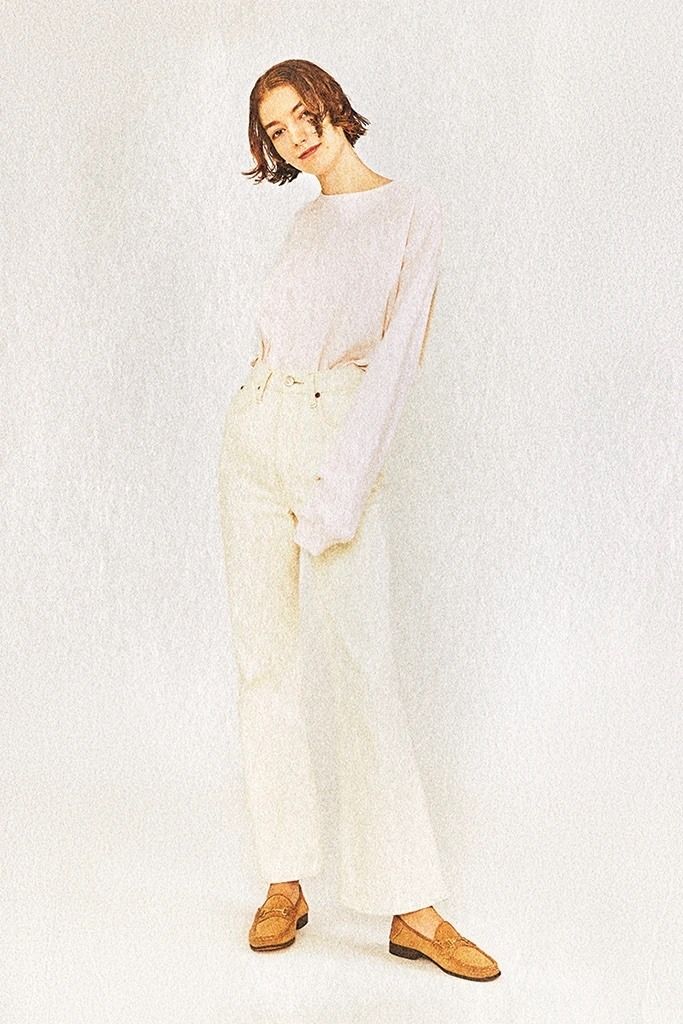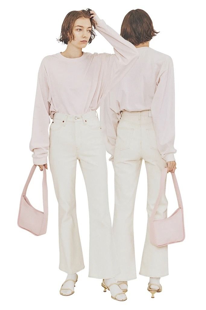 白とベージュピンクをブレンドしたようなロンTは、儚い色のイメージを裏切るようにメンズのLサイズで意外性を。レトロなフレアデニムも白ならクリーンでいられる、計算ずくのワントーン。