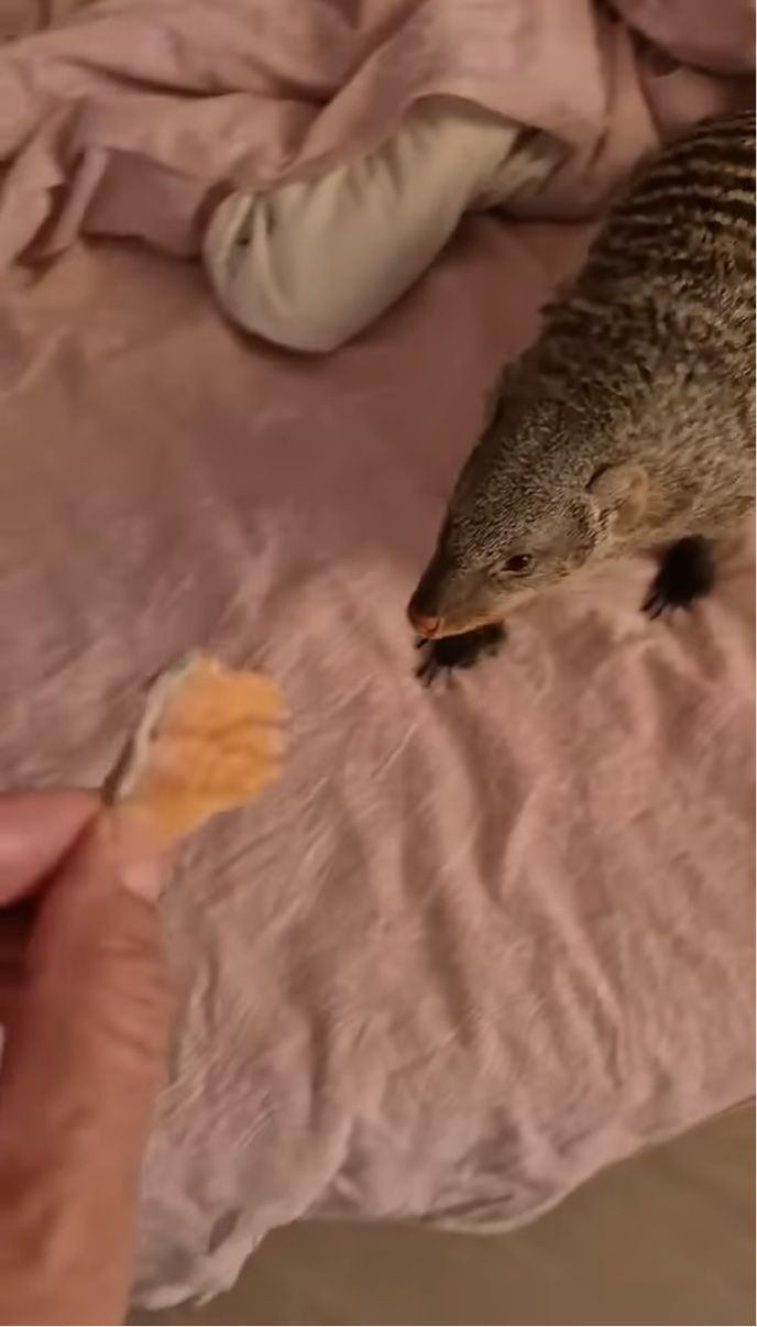 ごはんの香りに誘われてモゾモゾ。布団から出てきたのは・・マングース!?【海外・動画】