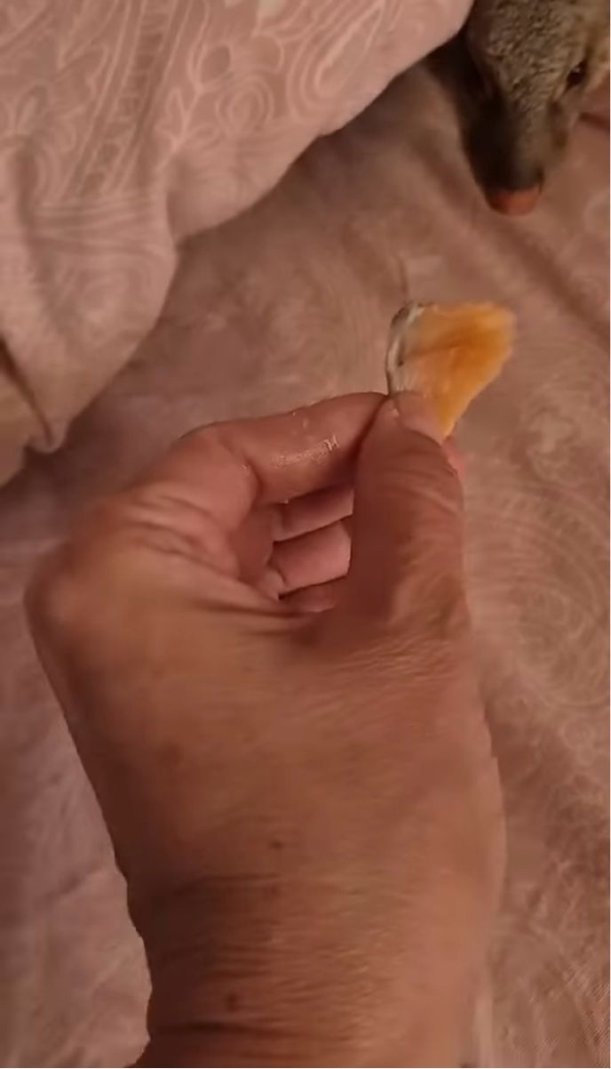 飼い主さんは、ペットのごはんであるサーモンを布団の近くで差し出しています。