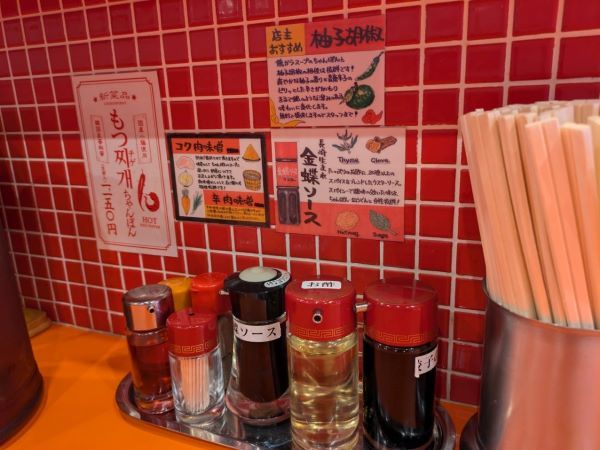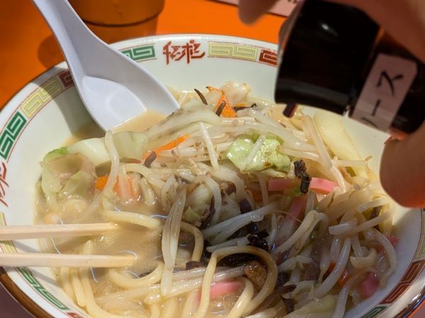 卓上には、定番の胡椒などのほかに、長崎では皿うどんに欠かせない「金蝶ソース」もあり、これがちゃんぽんにもお勧めとのこと。
