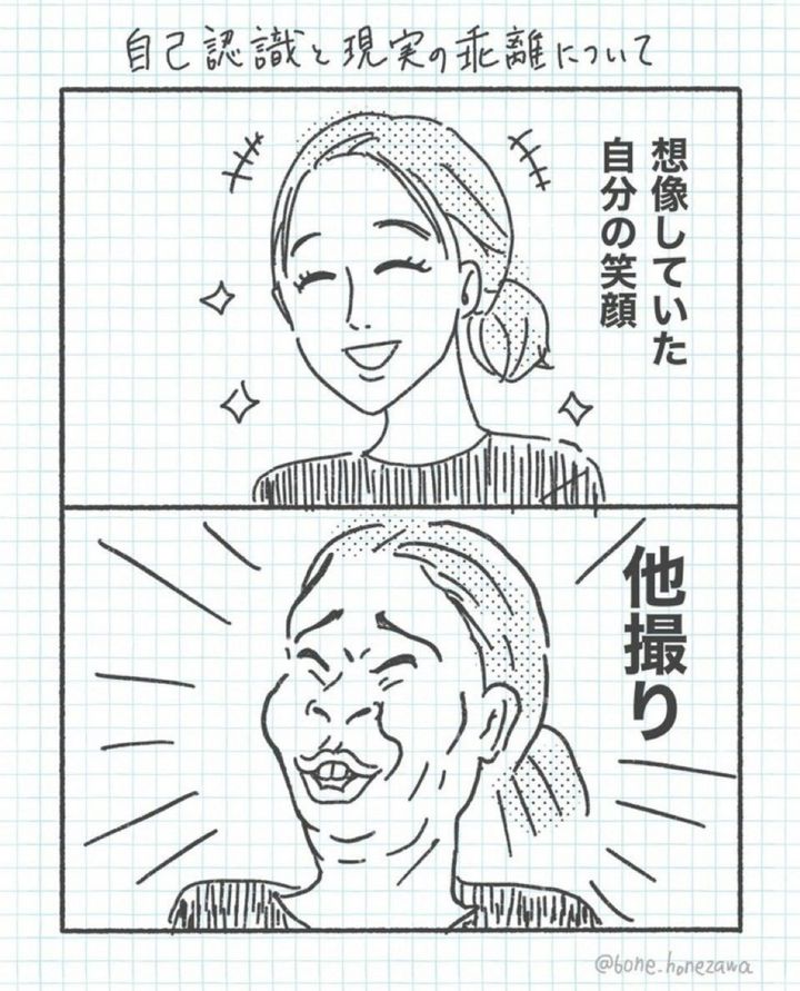 この記事ではX(旧Twitter)でバズった投稿を紹介します。今回紹介するのはほねざわ◎きれいになりたい38歳(@bone_honezawa)さんが投稿したある写真。皆さんは、理想と現実のギャップに打ちのめされたことはありますか?例えば写真を撮ったとき、にっこりとほほ笑んだはずなのに…いざ写り方を見るとがっかりしてしまうとか…。きっと多かれ少なかれ、経験があるのではないでしょうか。今回は、そんな思わず共感してしまうような投稿です。