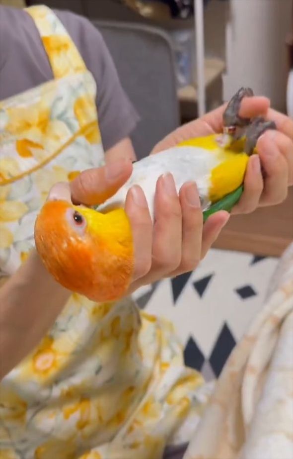 飼い主さんを信頼して身も心もゆだねているので、その体はまっすぐ横になっています。 インコは、このような体勢を取ることもできるんですね~。