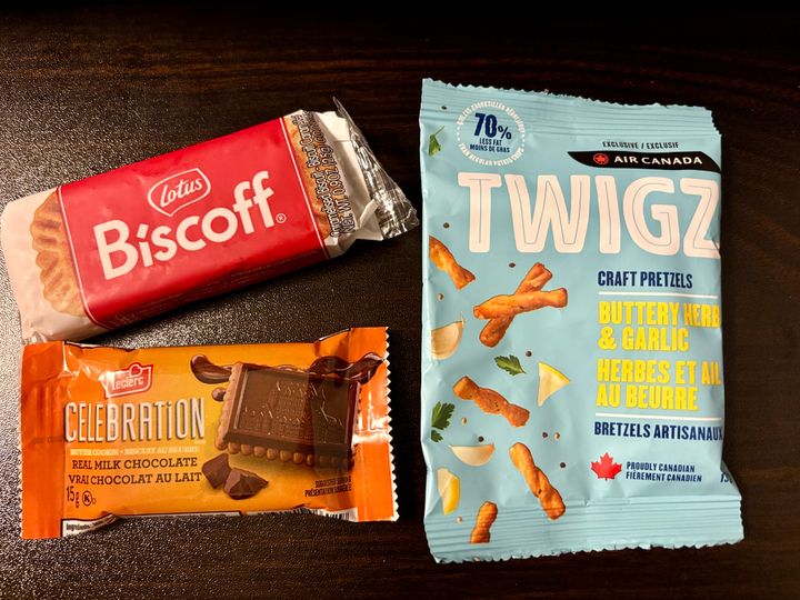 また、飛行中にギャレーにあるスナックもうれしいポイントです。エア・カナダでは3種類が用意されており、塩味の効いた「ツイグズ」というプレッツェル、シナモン風味の「ビスコフ」ビスケット、そしてチョコがけクッキーの「セレブレーション」があります。