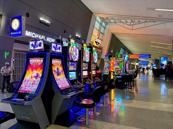 砂漠の中に忽然と現れるハリーリード・ラスベガス空港。ターミナルビルの中にもカジノマシーンやLAS VEGASのネオンサインも点在しているので、探して回るのも楽しい時間です。