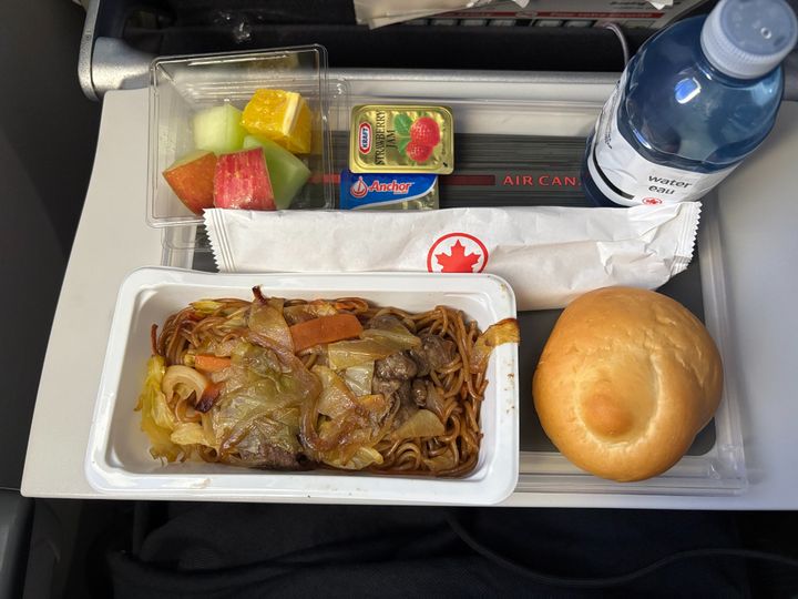 エア・カナダの機内食には、日本路線の“定番”とも言える冷たい日本蕎麦が必ず添えられており、日本人にとってはどこかほっとする味わいです。メインディッシュは2種から選べ、長時間のフライトでもしっかり食事を楽しむことができます。