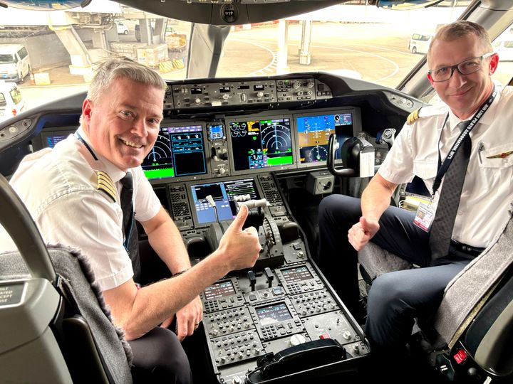 この旅の最終段階でボーイング787‐9が成田に到着した時のことです。降機時にコルマック・ワード機長がコックピットに迎え入れてくれました。元々、エア・カナダと合併する前のカナディアン航空でジャンボジェットを操縦していたとのこと。日本貨物航空(NCA)での操縦経験もあります。