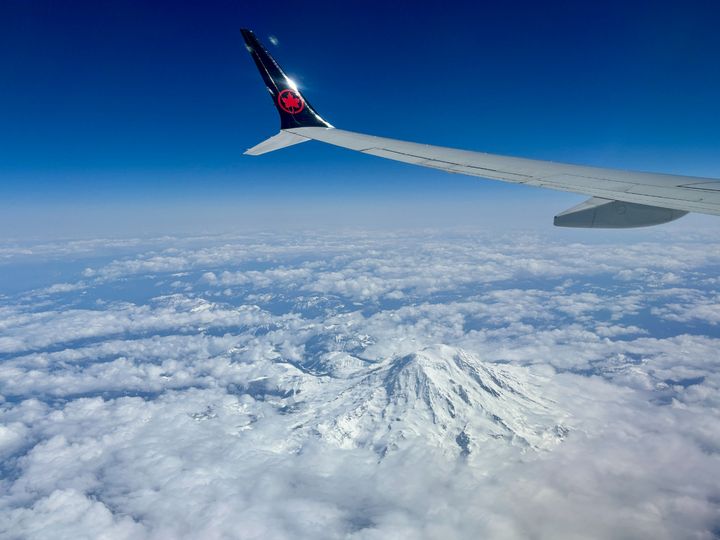 バンクーバーからラスベガスまではボーイング737Max8で2時間50分の飛行。途中、シアトルを超えるとアメリカの雄大な大地の景色を楽しむことができます。左手にレーニア山、続いてアダムス山の美しい白峰が姿を現しています。その後は茶褐色の大地が続く大自然を堪能し、時間はあっという間に過ぎていきました。