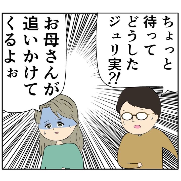 ジュリ実さんを追いかけ「ちょっと待って。どうしたジュリ実?!」とめが根さんが声をかけると、青い顔をしたジュリ実さんが「お母さんが追いかけてくるよぉ」と怯えて言うのでめが根さんは驚きます。なぜなら、ジュリ実さんの母親の姿などどこにもなく、ジュリ実さんが見ていたのは幻覚だったからです。
