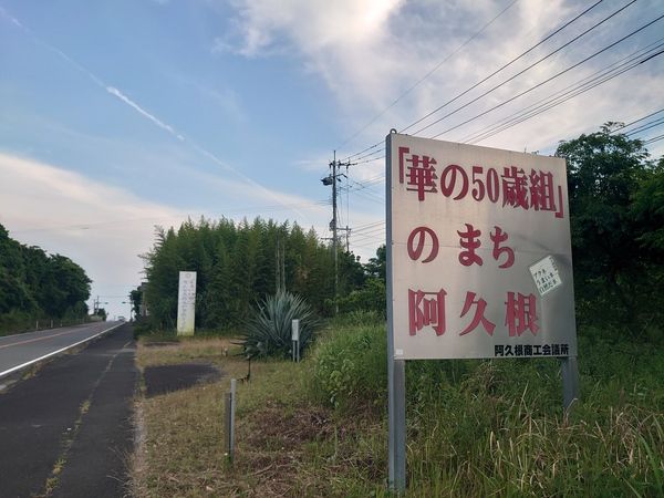 場所は国道3号線沿いで、「花の50歳組のまち 阿久根」と書かれた大きな看板のすぐそばに植えられています。隣にローソンがあるので停車しやすいです。