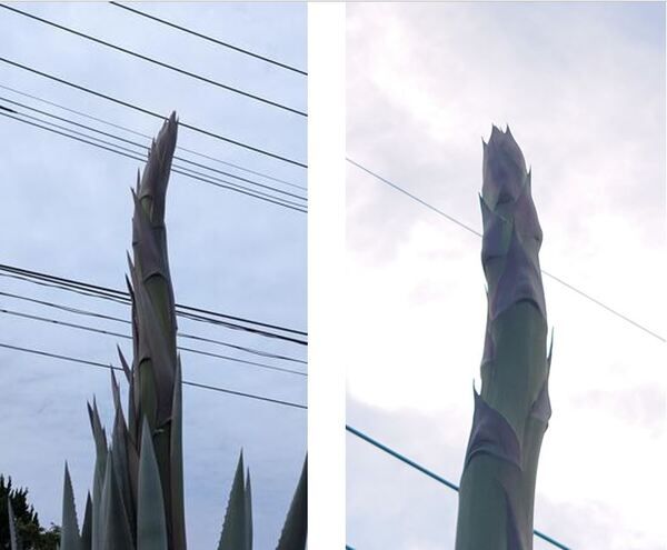 調べたところ、リュウゼツランは開花が近づくと花茎が非常に高く成長して、一般的には5メートルから7.5メートルほどの高さになるそうです。一方、阿久根市のリュウゼツランは3~4メートルほどでした。知人は「もうじき咲きそう!」と言っていましたが、思ったよりも開花にまだ時間がかかりそうな…