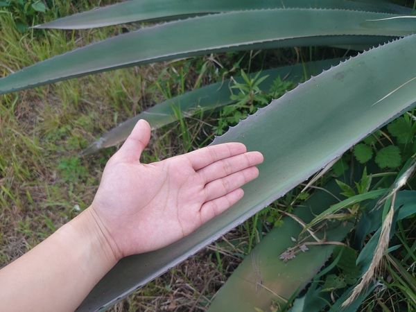 「よっ!!さすが北米産!!」と囃し立てたくなるほどビッグサイズ!!人間の身長をゆうに凌駕!!巨大なアスパラガスのような花茎がまっすぐ天に向かって伸びていて、葉の表面は硬く、トゲも鋭く、幅は私の手ぐらいあってドキドキしました。