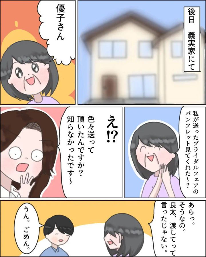 「優子さん!私が送ったブライダルフェアのパンフレット見てくれた~?」義母にそう言われ、「え!?色々送っていただいたんですか?知らなかったです~」と驚きながら答えると、「あらっ。そうなの。良太、渡してって言ったじゃない」義母に言われて「うん。ごめん」と謝る良太。