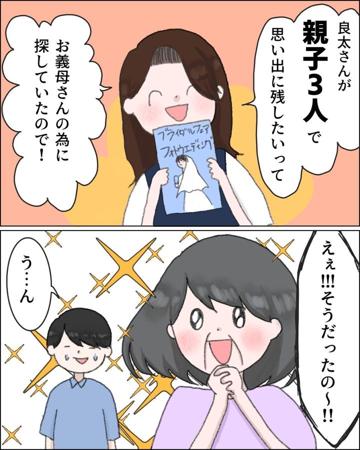 「良太さんが、親子3人で思い出に残したいって、お義母さんのために探していたので!」私の言葉を聞いた義母は、「えぇ!!!そうだったの~!!」と目をキラキラさせて言喜び、良太は「う・・ん」としか言えませんでした。