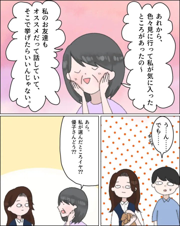 山盛りのブライダルフェアのパンフレットを良太さん経由で送ってきた義母に辟易する私は、「パンフレットを見てくれた~?」と聞かれた際、「色々送っていただいたんですか?知らなかったです~」ととぼけ、「私が選んだところイヤ??優子さんどう??」と詰め寄られ、「また見せていただきますね」と答えた後、「私たちの式場の話よりも、お義母さん忙しくなりません?」その言葉に義母はビックリ!「良太さんが親子3人で思い出に残したいってお義母さんのために探していたので!」優子さんの言葉を聞いて、「えぇ!!!そうだったの~!!」とはしゃぐ義母なのでした。