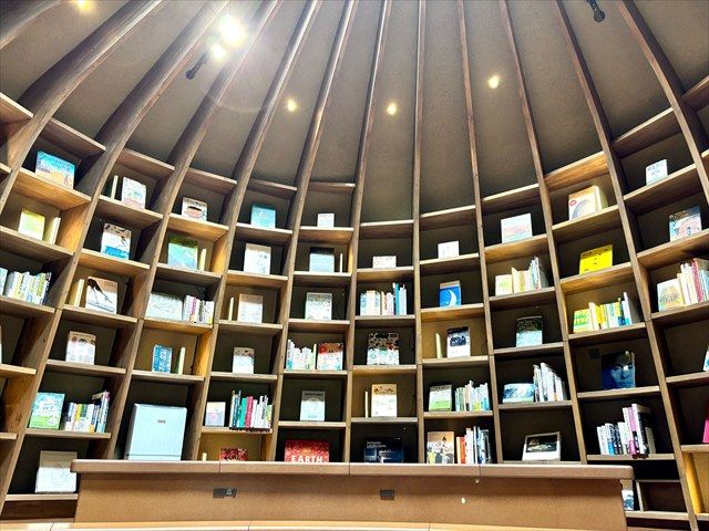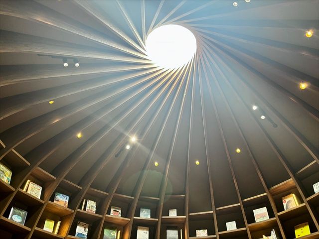 特徴的なのが、本棚の柱がそのまま頭上へと伸びて梁になっている構造です。天井はドーム状になっていて、その梁の部分をよく見ると、28本の梁がそれぞれ斜めに傾きながら、お互いに支え合うように組まれています。この構造には、「人は支え合って生きている」というメッセージが込められているそうです。