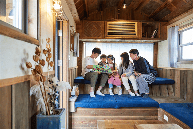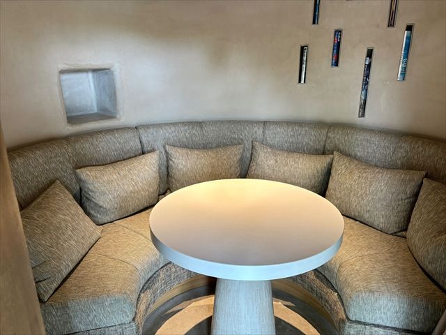 小さな窓が天井や壁にたくさん付いた、まるで車のような見た目の「TINY HOUSE VILLAGE」。併設された「CENTER HOUSE(センターハウス)」には、アナログオーディオやBARカウンターが設けられたリビングスペースもあります。