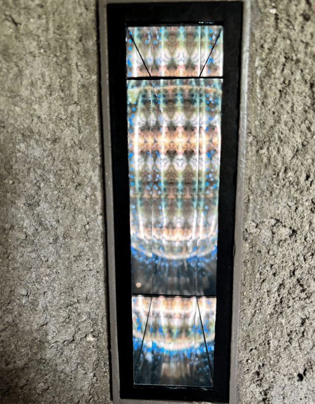 地中図書館には、ちょっとした遊び心があちこちに隠れています。たとえば、本棚のあいだには、なんと万華鏡が挟まれている場所も。のぞいてみると、思わず見とれてしまうほど綺麗です。