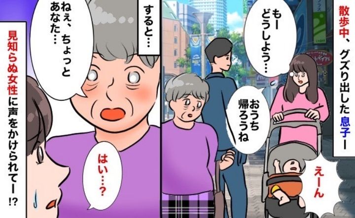 長男が1歳のとき、天気が良い日にベビーカーで最寄り駅近くを散歩していました。眠くなってきたこともあり段々ぐずり始めた息子。周りからの視線を気にしつつあやしていると、突然見知らぬご年配の女性が近づいてきて強い口調で声をかけてきたのです――。