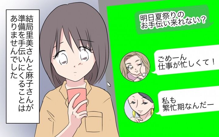 結衣たちは夏祭りの準備に忙しくしていましたが、里美と麻子は来る気配すらなし。