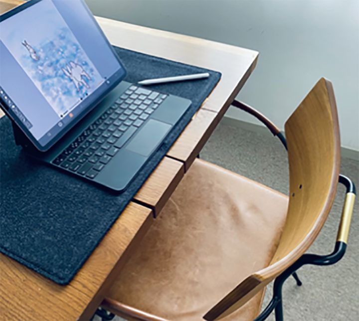 エッセイとイラストは全てiPad一つで作業しています。いつもダイニングテーブルの隅っこで作業していますが、ここに座るときは母から仕事モードに切り替えて没頭できる、私にとってリフレッシュの時間でもあるので、お家の中の好きな場所です。