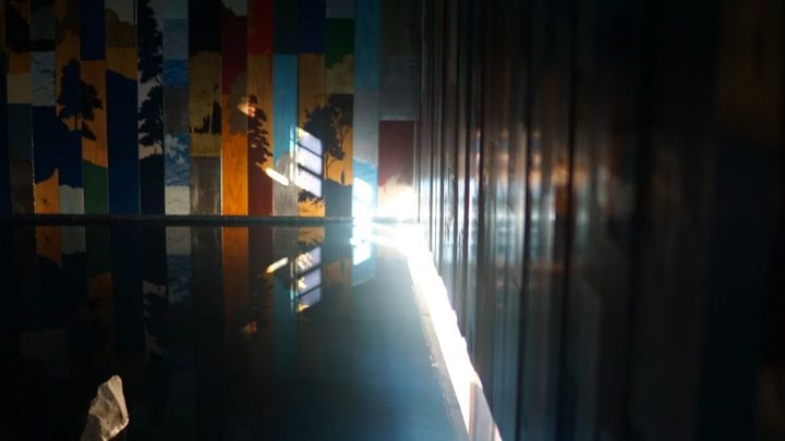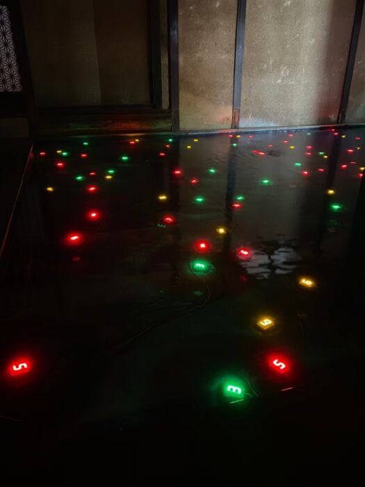 真っ暗な部屋の中にあるのは、5畳ほどある水の貼られたスペースと、その水中に設置された小さな電光板だけ。