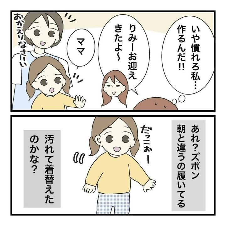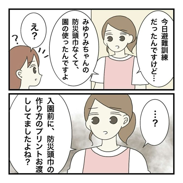 仕事が終わり、自分の子ども2人を迎えに行った主人公のまりな。そこで避難訓練があったことなど、その日の活動について報告を受けていたまりなですが、保育士さんからあることを伝えられます。
