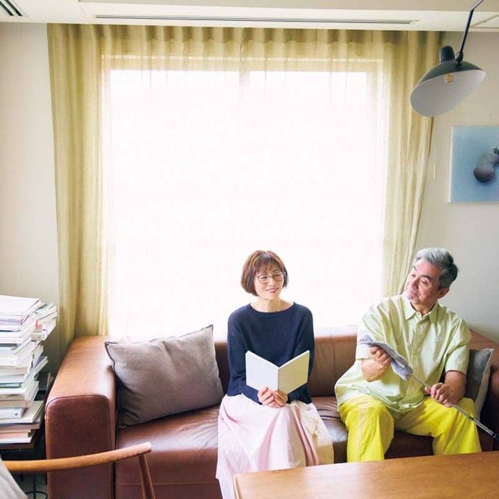 雨降りの午後は、気分が上がるきれい色のスカートに楽ちんニットでゆったり読書。あら、雄三さん、またゴルフクラブを磨いてる。「最近、筋肉がついて結構飛ぶんだよ。スコアもぐんぐんよくなってね」と上機嫌。クラブより、お風呂磨いてくれると嬉しいんだけどな。 メガネ¥46,200/アイヴァン(アイヴァン 東京ギャラリー)【雄三】シャツ¥9,900、パンツ¥12,430/ともにナイキ スポーツウェア(ナイキ カスタマーサービス)