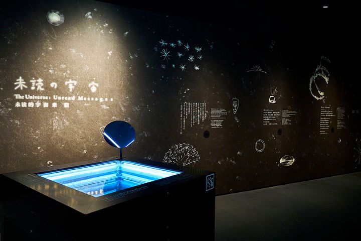 私たちの周囲を飛び交う見えない粒子を可視化する「霧箱」があり、壁面には宮沢賢治の「春と修羅・序」の一節、日常と物質・天体・宇宙との関係を語る詩やイラストがちりばめられています。壁面から聞こえる朗読は、俳優の池松壮亮さん、モデル・歌手の甲田益也子さんが担当しています。