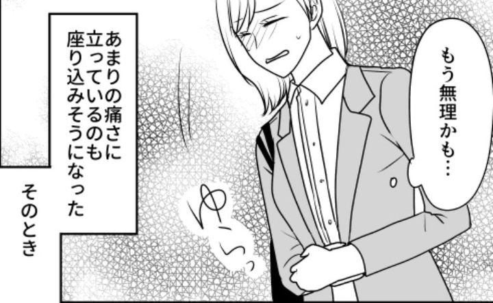 いつも通り朝の通勤電車に乗り込むと、人がぎゅうぎゅうで立っているのもやっと。耐えながらつり革につかまっていると、猛烈に腰と腹部が痛みだしたのです。あまりの痛さに立っているのもキツく、「誰か助けて……」と思いながら座り込もうとしたそのとき、女性の声が聞こえてきました。