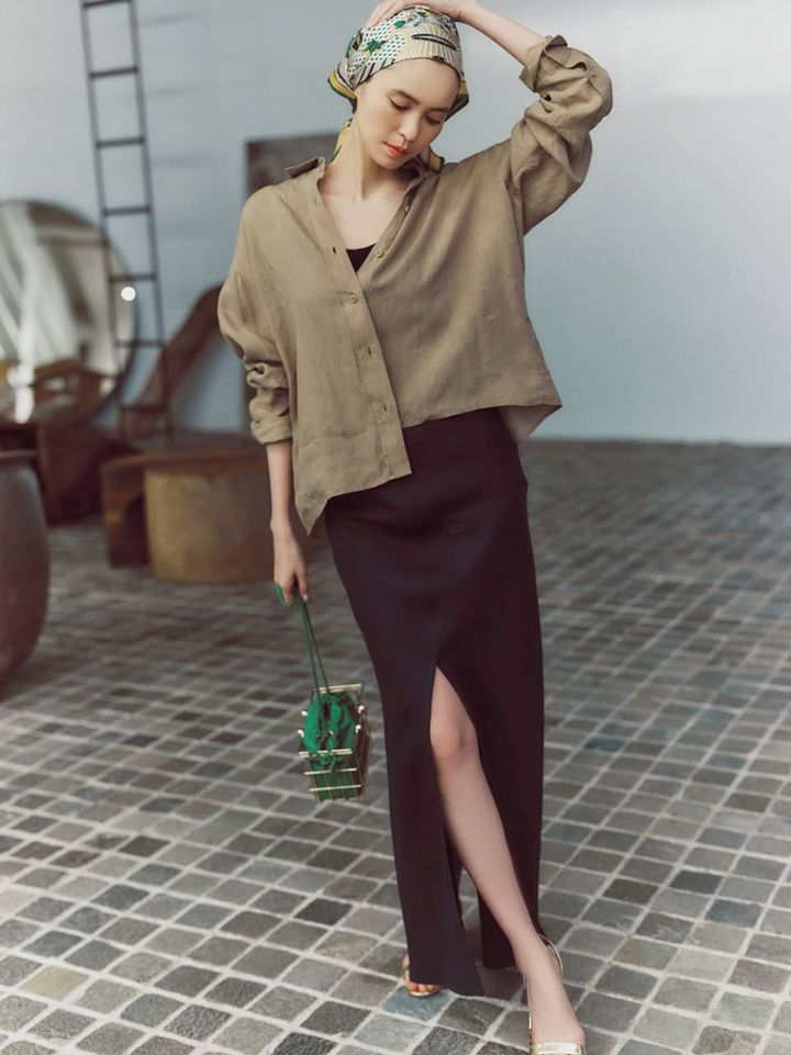 シャツ¥34,100、中に着たタンクトップ¥12,100、スカート¥31,900(全てドゥーズィエム クラス)、バッグ¥78,100(ザンケッティ)、サンダル¥121,000(アクアズーラ/全てドゥーズィエム クラス 青山店)、頭に巻いたスカーフ¥22,000(マンプリ)