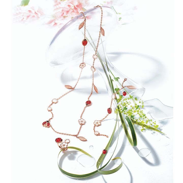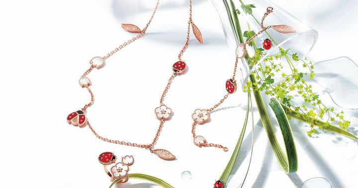 スズランは“幸福の再来”という花言葉を持ち、その可憐な佇まいは、昔からメゾンにインスピレーションを与え続けています。冬から春にかけて花開くプラムは、再生と復活のシンボル。そして愛らしいてんとう虫は、太陽に向かって飛ぶ姿から日本では“天道虫”と呼ばれていますが、世界中でも幸せのシンボルとして親しまれています。用いられているマテリアルは、カーネリアン、オニキス、ホワイト マザーオブパール、そしてローズゴールド。暖かな色合いが調和し、春のジュエリーの存在感をより一層高めています。