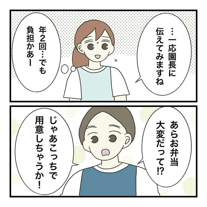まりなは自分の子どもが通う「保護者の負担多めの園があること」を知っているだけに、「お弁当も園で用意してくれないか」という保護者の気持ちに少しびっくりします。