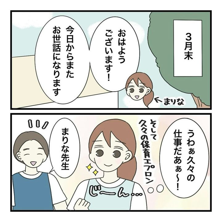 まりなが勤める保育園は「手ぶら登園」が特色であり、家庭からの持ち物は着替えのみ、保護者の負担がないよう配慮されていました。